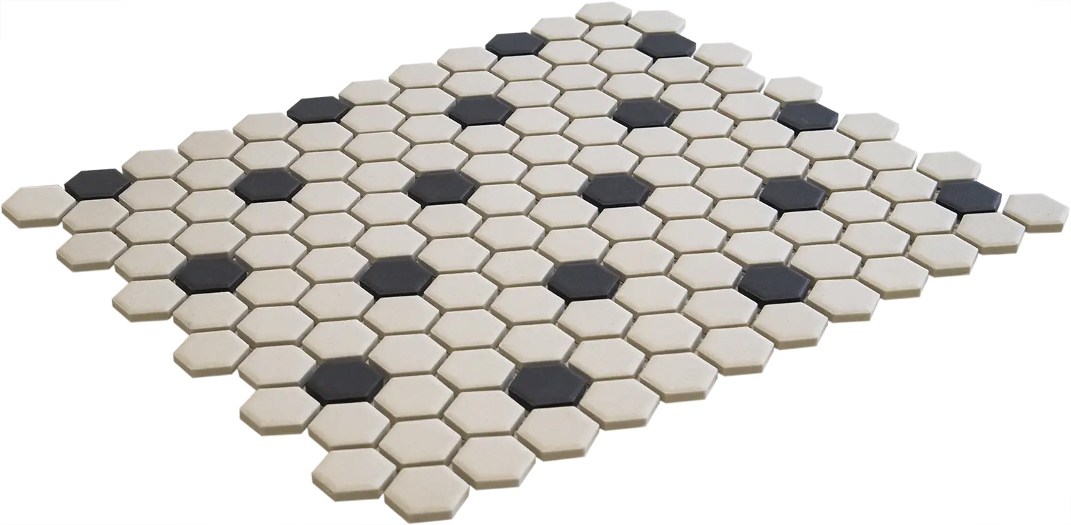 Deze mozaïek tegel wordt geleverd op vellen van 26×30 cm, de afmeting per mozaïeksteentje is 2,3×2,6 cm.